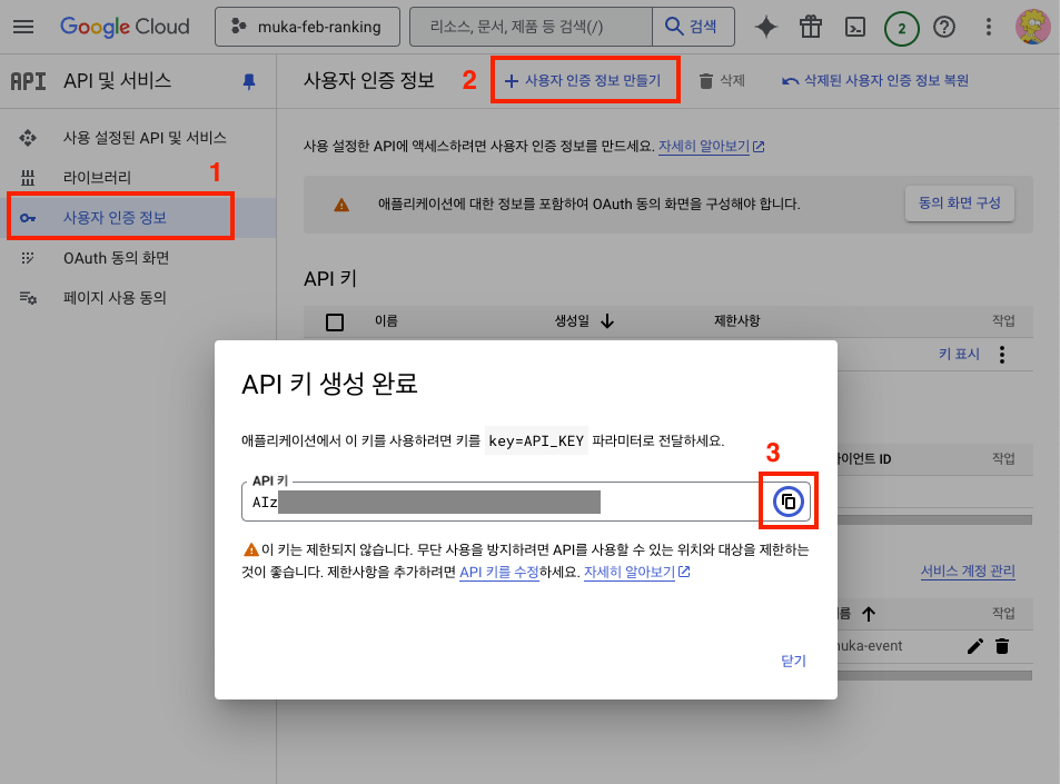 사용자 인증정보 > + 인증정보 만들기 > API 키 생성 을 해주었다