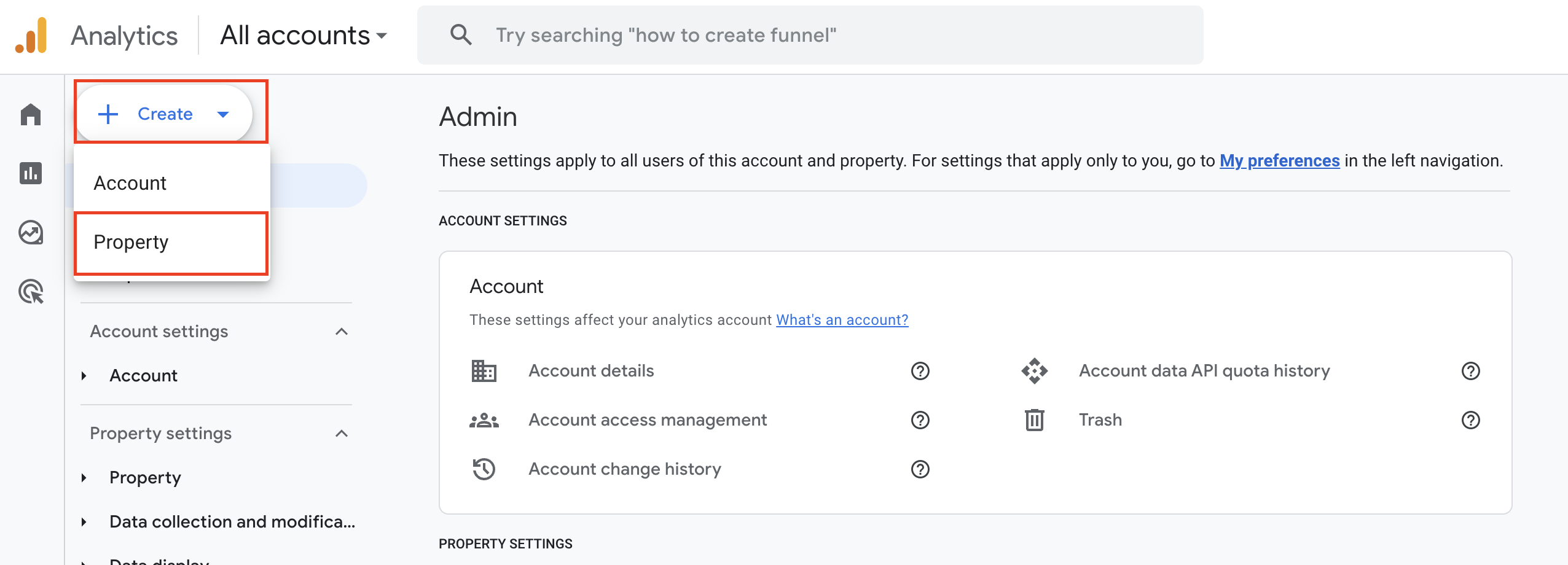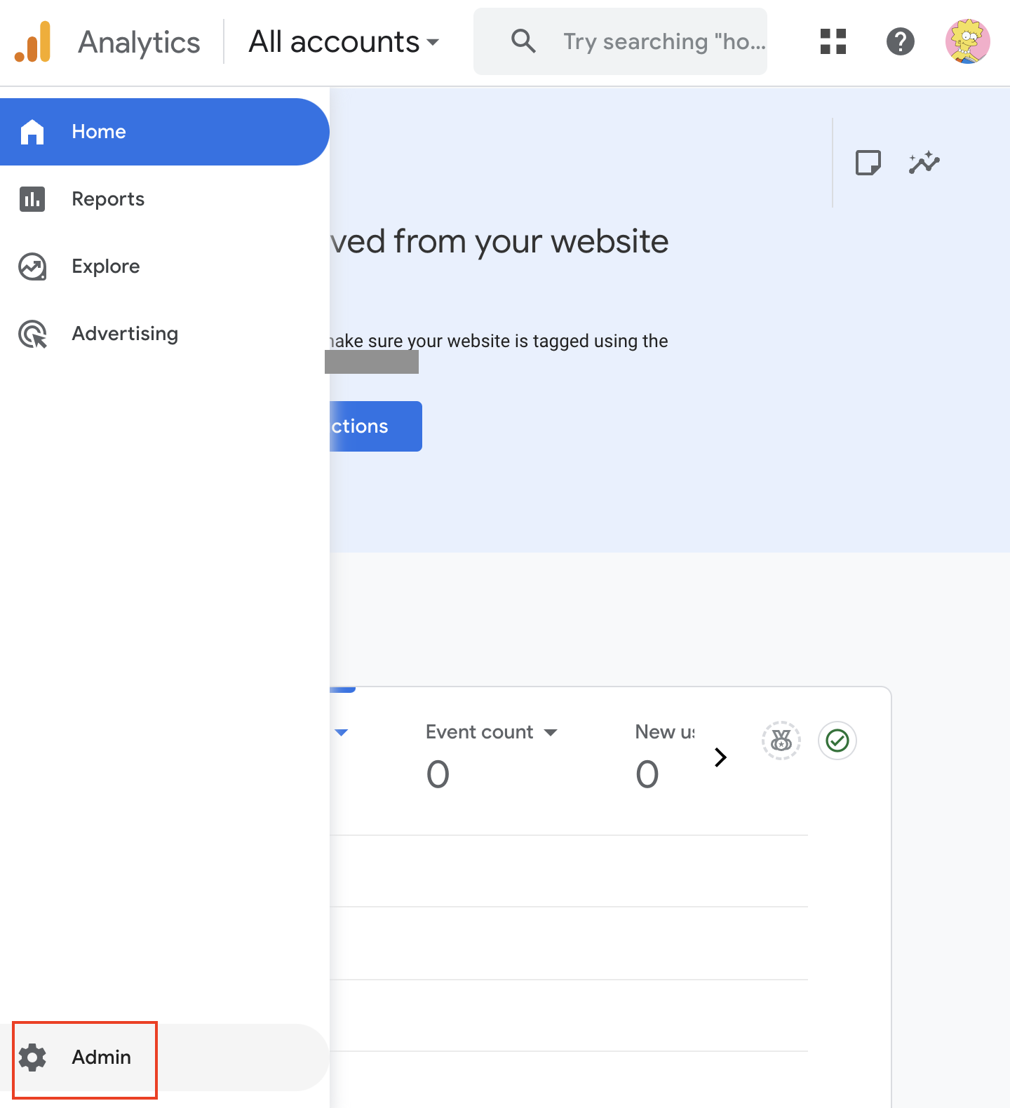 1. 구글 계정으로 텅~ 비어있는 GA 페이지로 진입해보자. 메뉴 패널 > 어드민 메뉴로 들어가보자