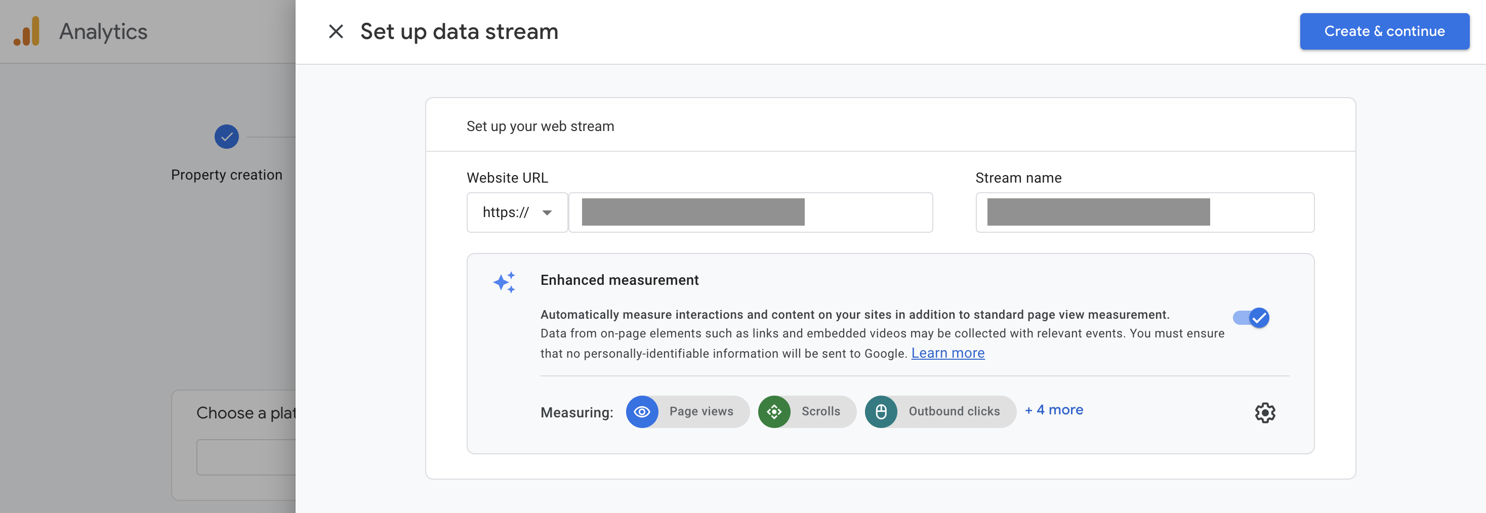 4. 마지막 단계에서 choose a platform > web 을 선택했더니 set up data stream 패널이 튀어나와서 입력을 같이 해주었다.