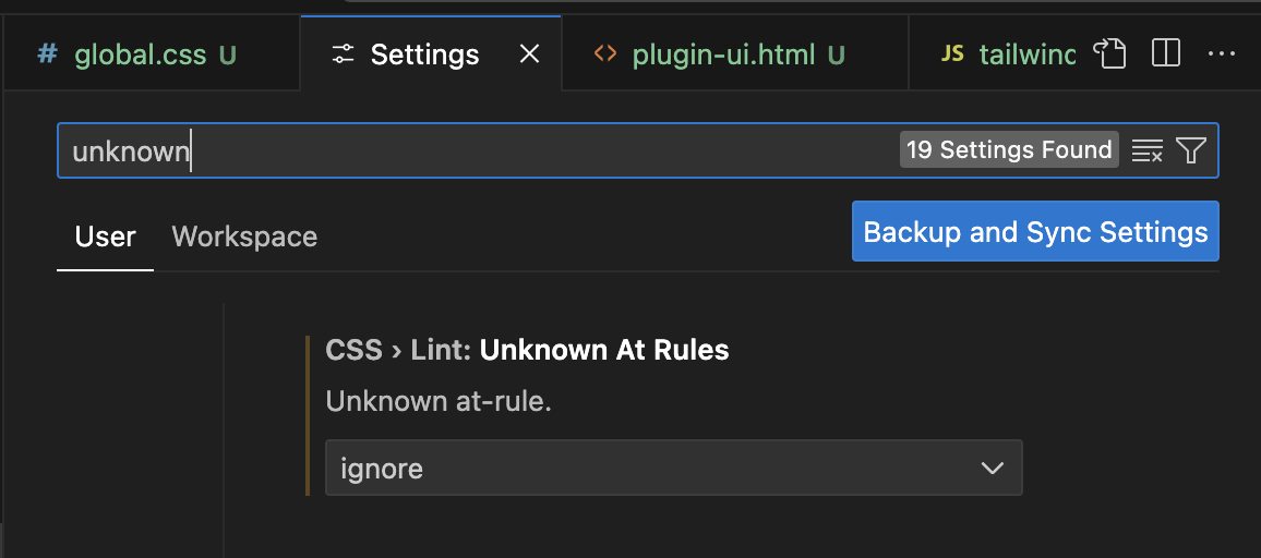 @tailwindcss 부분에 노란 경고줄이 떳다. gpt 도 설치잘한거냐는 헛소리를 해서 포기하고 스택 오버플로우를 뒤지다가 vscode 세팅을 변경하여 해결하였다. warning -> ignore 로 변경하기