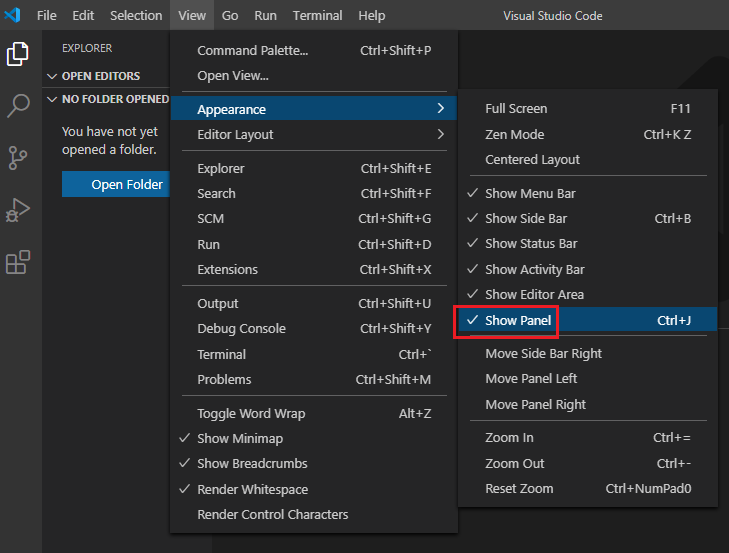 1. VS화면 상단 메뉴에서 view-appearance-show panel