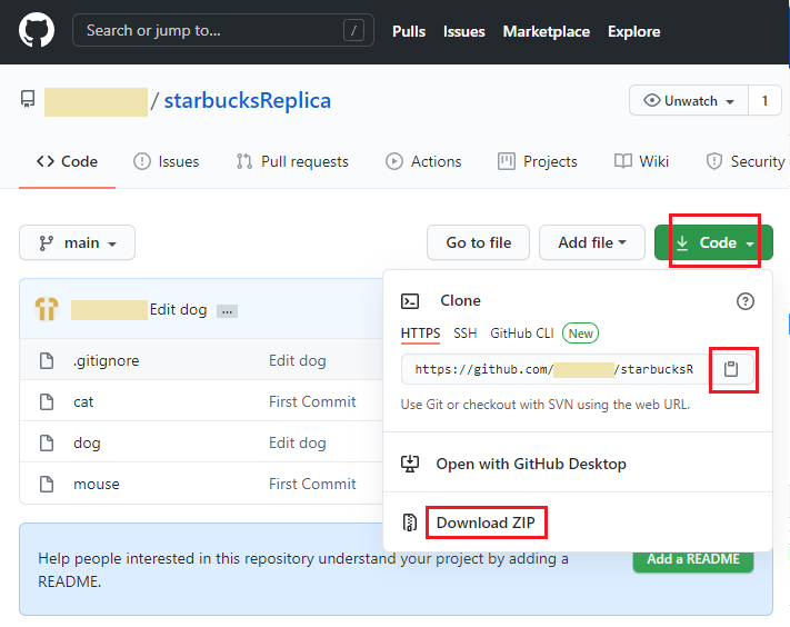 1. Code 버튼을 눌러 url 복사 / 파일 다운로드 받는다.