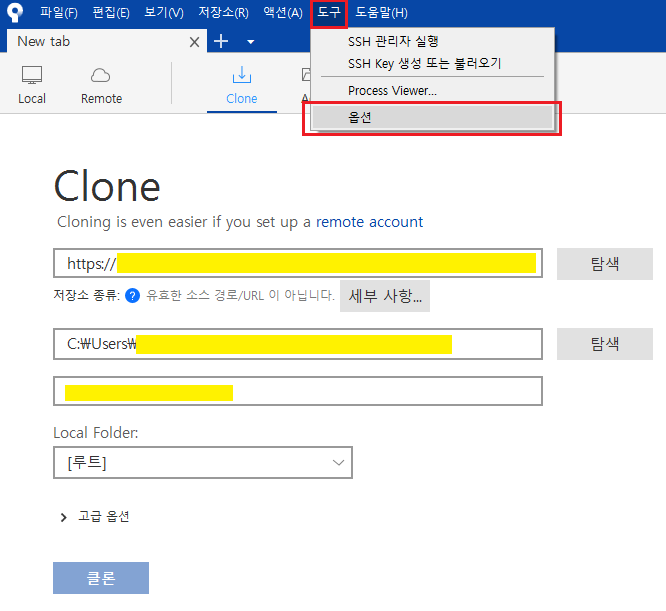 소스트리(SourceTree)와 빗버켓(bitbucket) 연결 중, 클론(Clone)에서 소스경로 입력시 오류메시지를 받았다.