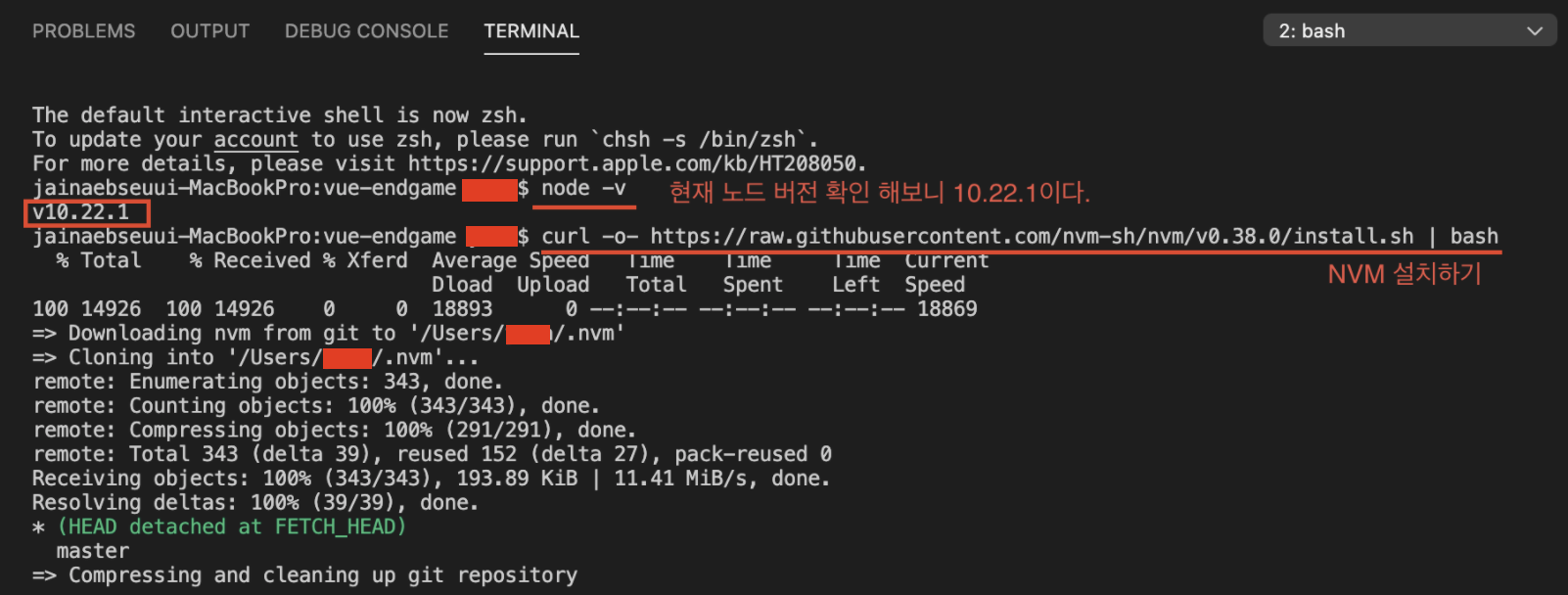 1. 터미널을 열고 shell 을 bash 로 선택 하자. 그리고 현재 노드버전 확인해보자.(비교를 위해) 그리고 NVM 설치하기