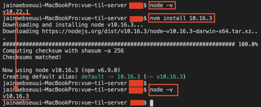 nvm install 10.16.3 // 으로 노드버전을 v10.22.1에서 v10.16.3으로 변경완료!