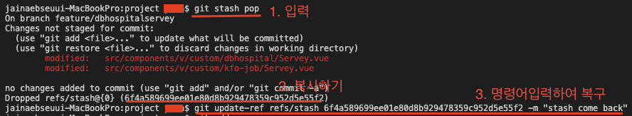 3. 아래 명령어에 가져다 붙여라 git update-ref refs/stash 레퍼런스 -m "메시지적기"