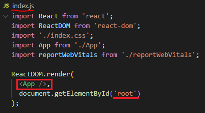 3. index.js에서는 App.js에서 만든 App클래스 내용을 끌어와 index.html의 root 태그에 뿌린다.