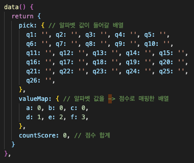 - pick : 라디오 버튼에서 선택한 알파벳이 들어갈 객체배열 이다.