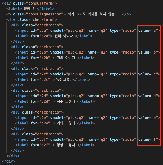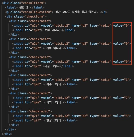 - 원인은 input 의 value 가 셋 다 같은 값이기 때문이다. 아래는 내가 짠 코드이다. 빨간 박스의 value 가 0 으로 같다.