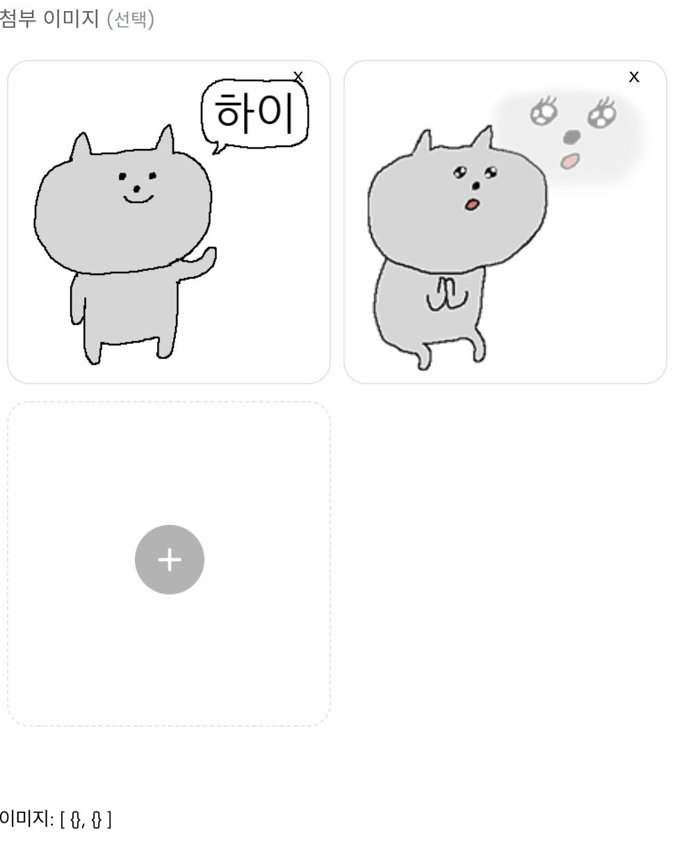 + 버튼을 누르면 파일 업로드 창이 열리고, 이미지를 업로드하면 미리보기 와 삭제가 된다.