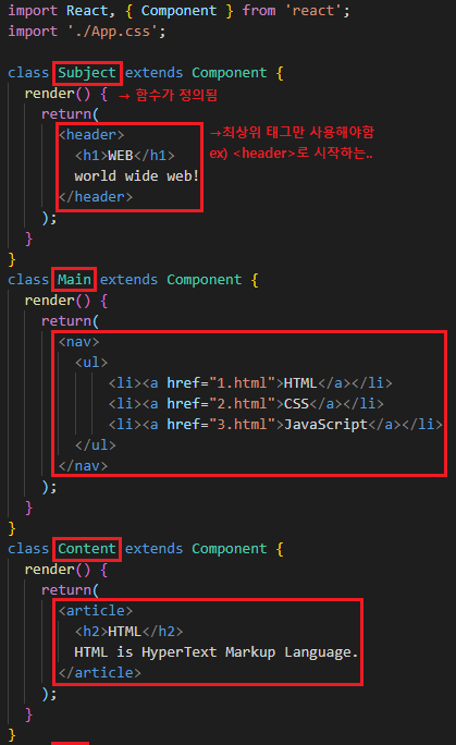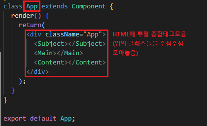 2. App.js 파일에서 Component라는 클래스를 상속받는 사용자정의 클래스를 만든다. → 후에 html에서 사용자 정의 태그로 사용됨