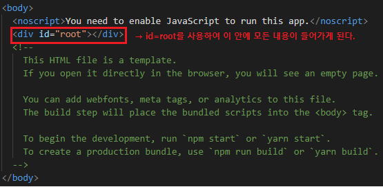 웹브라우저는 리액트라는 기술을 알지못한다. 리액트가 html 형식으로 제공되어 읽을 수 있는 것이다.