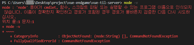Vue 실행오류 - 'node' 용어가 cmdlet, 함수, 스크립트 파일 또는 실행할 수 있는 프로그램 이름으로 인식되지 않습니다.