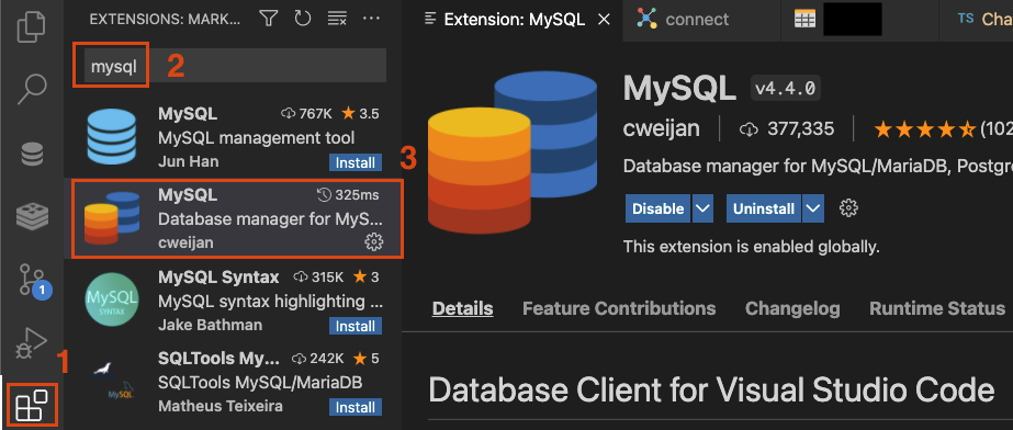 1. extension tab을 열어 MySQL을 install 한다.