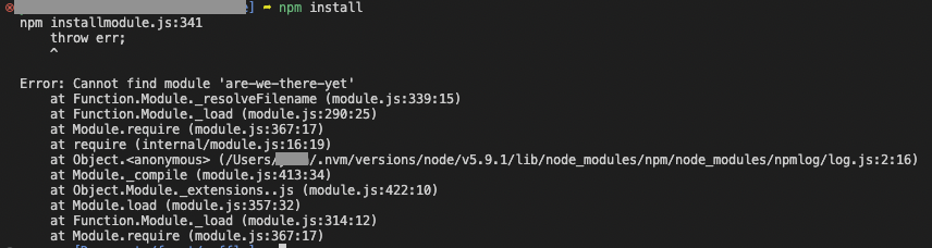 npm 실행오류 - Cannot find module 'are-we-there-yet'