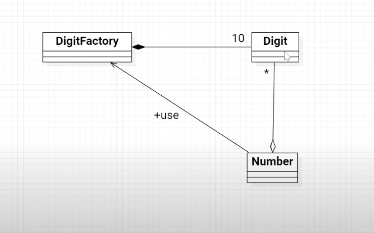 내부에는 pool 이라는 10개의 저장 공간을 만들어두고, 매개 변수로 받은 인덱스에 값이 있으면 해당 Digit 객체를 반환하고, 아니면 새로운 객체를 생성한다. => 여기에서 이미 생성된 놈은 중복생성을 안하고 가져다 쓰는 개념을 실행한다.