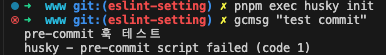 일부러 규칙에 어긋나게 커밋을 해보았다. 커밋이 막힌다 👍