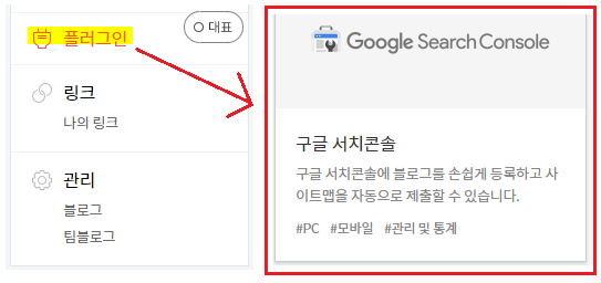 1. 관리자메뉴에서 [플러그인]을 눌러 [구글서치콘솔] 을 찾아 클릭한다.