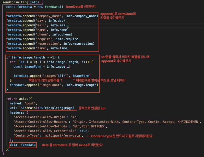FormData의 append()란 FormData 객체의 기존 키에 새 값을 추가하거나, 키가 없는 경우 키를 추가하는 메소드이다.