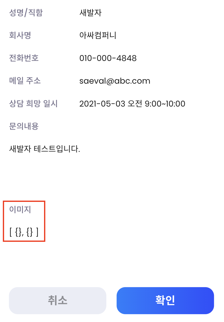 상담 작성란을 모두 작성 후, 마지막으로 다중 파일 선택을 한 뒤 "상담요청" 버튼을 누르면 작성한 데이터와 함께 확인페이지로 넘어간다.